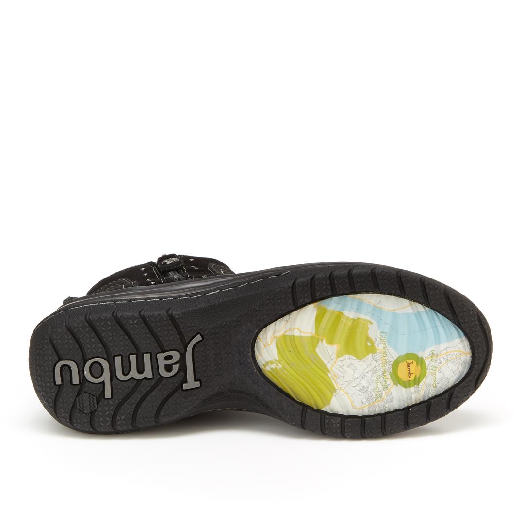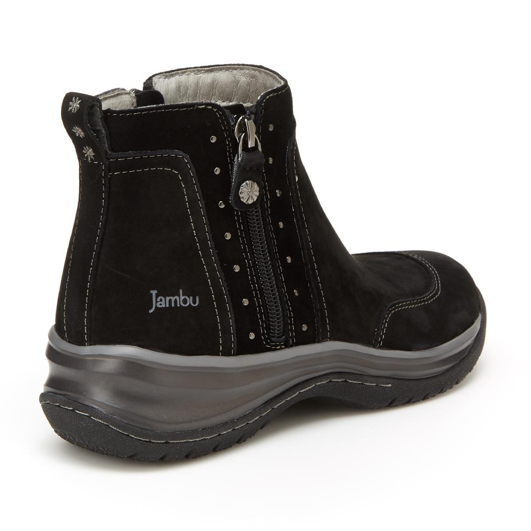Bridge the worlds of water-resistant comfort and whimsical style with this slip-on ankle bootie. A Jambu Originals style, the Camryn is made of nubuck and kid suede that sheds water to keep feet dry and has a discreet inside zip closure. Underfoot, every step feels like walking on air thanks to memory foam cushioning. Not only does the insole offer all-day comfort, but also shock absorption, moisture wicking, and antimicrobial lining. Navigate any surface with the non-slip All Terra map outsole.