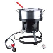 The 18-inch tripod cooker stand boasts a wide and sturdy base, complemented by three extra stabilizer feet. The robust 10-quart aluminum fry pot, measuring 12 inches across, is equipped with dual side handles. For added convenience, a lightweight strainer basket is included, complete with a comfortable rubber-coated handle and a rear-base clip to facilitate food draining after frying or boiling. Furthermore, the high-efficiency burner delivers a powerful 41,000 BTUs.