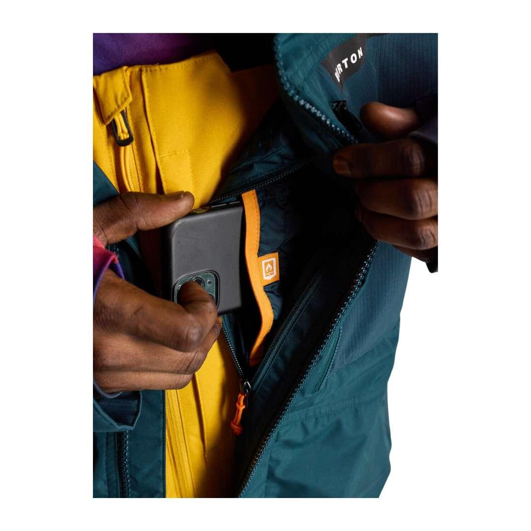 Interior mesh dump pockets, zippered chest pockets, zippered media/goggles pocket with therma-pocket inside to keep your device warm, zippered microfleece hand-warmer pockets, and zippered pass pocket