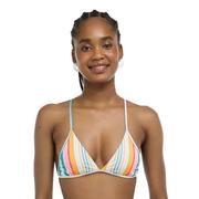 The Eidon Santo Domingo Mila Bikini Top is a sleek take on the classic triangle style, designed for comfort and customizable fit. Crafted from soft recycled nylon-spandex, it features a fixed triangle front and a convenient two-way tie-back that allows you to adjust for either criss-cross or straight straps. Removable soft cups offer subtle shaping and easy customization—ideal for both beach lounging and active water days.