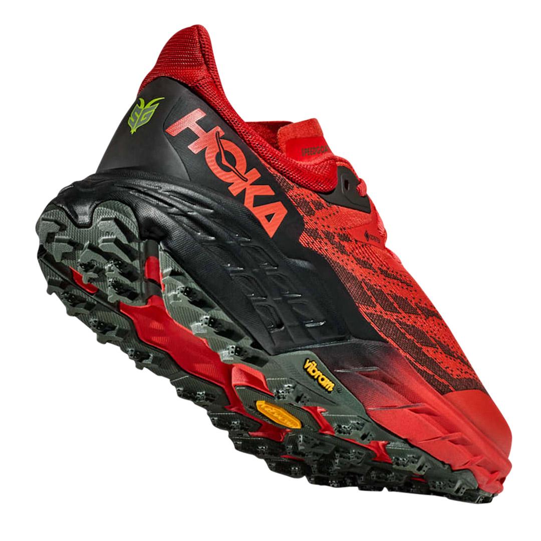 The Speedgoat 5 is a trail running shoe designed to excel in sloppy and wet conditions. It features a brand-new upper and improved moisture management with a GORE-TEX membrane. This addition helps keep your feet dry and comfortable even when running through wet and muddy terrain.