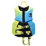 The Hyperlite Boys Child Life Vest is designed to provide safety and comfort for young users during water activities. It features adjustable straps and a front zipper for a secure, customizable fit. The soft neoprene material helps improve comfort against the skin, while bright colors and patterns enhance visibility on the water. Suitable for boating, swimming, and other watersports, this vest is built to support both safety and ease of movement.