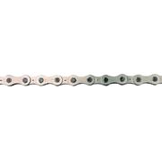 The chain features a nickel-plated steel construction, which not only enhances its durability but also helps prevent rust and corrosion. This coating extends the chain's lifespan, allowing for long-lasting performance even in challenging riding conditions.